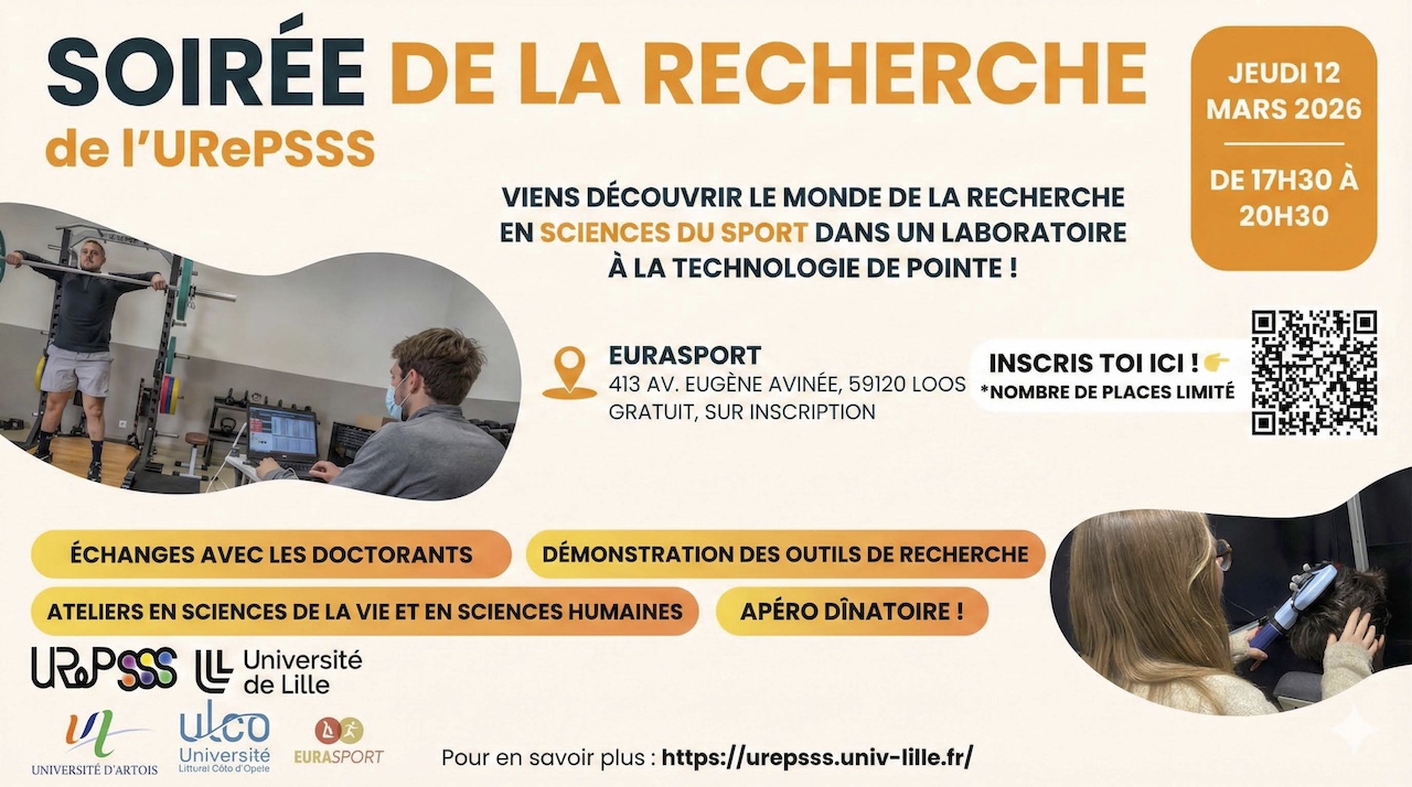 Plongez au cœur de l'innovation lors de la Soirée de la Recherche de l'URePSSS, le jeudi 12 mars 2026. Cet événement exclusif vous ouvre les portes d'un laboratoire de pointe pour une immersion totale dans l'univers des sciences du sport. Tout au long de la soirée, tu auras l'opportunité unique d'échanger directement avec nos doctorants, qui te partageront leurs travaux et leur quotidien de jeunes chercheurs.